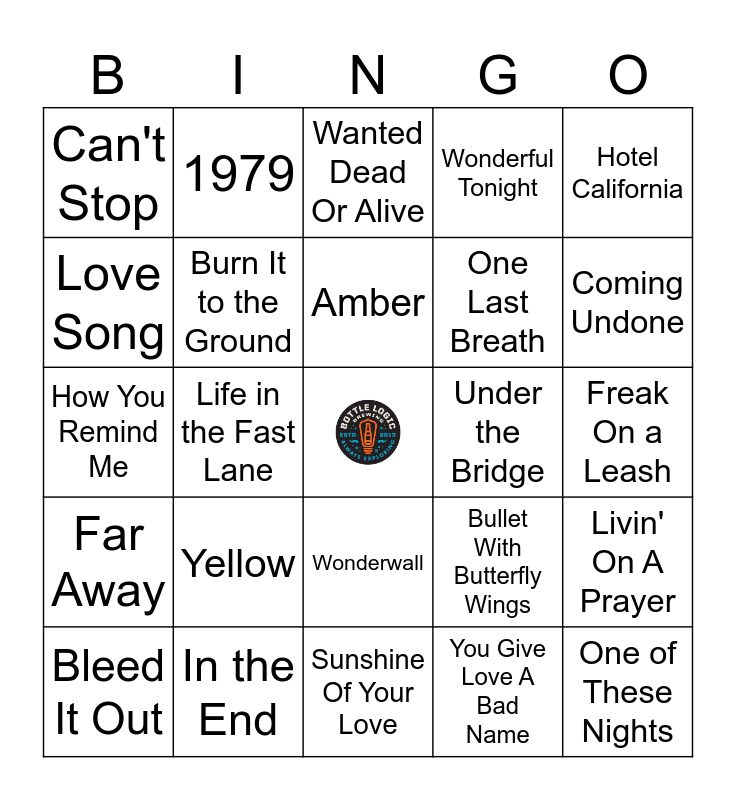 This bingo card has a free space and 24 words: Yellow, In the End, Amber, Bleed It Out, Hotel California, Can't Stop, Love Song, 1979, Under the Bridge, Wonderwall, One Last Breath, How You Remind Me, Bullet With Butterfly Wings, Livin' On A Prayer, Burn It to the Ground, You Give Love A Bad Name, Freak On a Leash, Wanted Dead Or Alive, Coming Undone, Life in the Fast Lane, One of These Nights, Far Away, Wonderful Tonight and Sunshine Of Your Love.