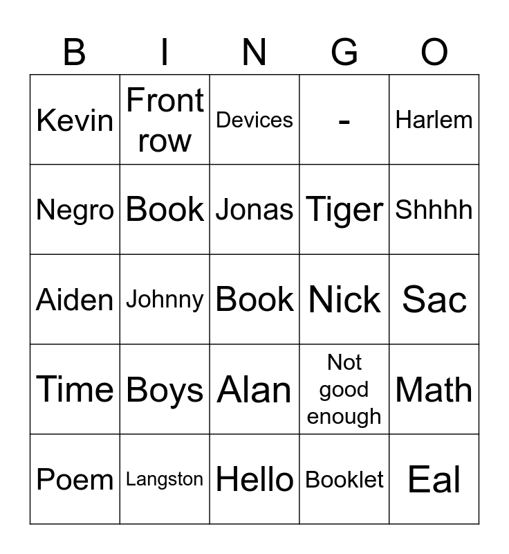 This bingo card has 25 words: Boys, Hello, Jonas, Poem, Harlem, Kevin, Negro, Front row, Nick, Alan, Tiger, Aiden, Not good enough, Math, Book, Eal, Sac, Devices, Shhhh, Johnny, Book, Langston, Time, - and Booklet.