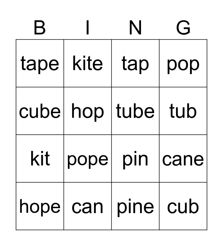 This bingo card has 16 words: can, cane, tap, tape, kit, kite, pin, pine, cube, hop, hope, pop, pope, tub, tube and cub.