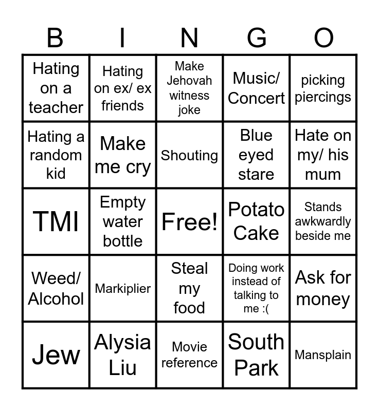This bingo card has a free space and 24 words: Markiplier, Alysia Liu, Shouting, Jew, picking piercings, Hating on a teacher, Hating a random kid, Hating on ex/ ex friends, Potato Cake, Steal my food, Blue eyed stare, TMI, Doing work instead of talking to me :(, Ask for money, Make me cry, South Park, Stands awkwardly beside me, Make Jehovah witness joke, Hate on my/ his mum, Empty water bottle, Mansplain, Weed/ Alcohol, Music/ Concert and Movie reference.