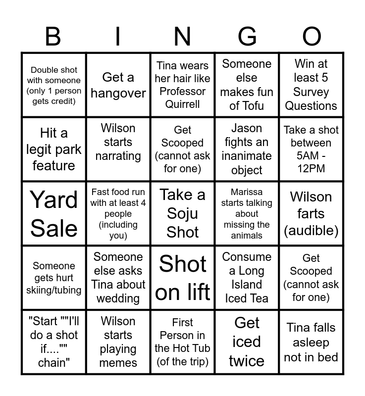 This bingo card has a free space and 24 words: Someone else asks Tina about wedding, Wilson starts playing memes, Get Scooped (cannot ask for one), "Start ""I'll do a shot if...."" chain", Win at least 5 Survey Questions, Double shot with someone (only 1 person gets credit), Hit a legit park feature, Get a hangover, Marissa starts talking about missing the animals, Shot on lift, Jason fights an inanimate object, Yard Sale, Consume a Long Island Iced Tea, Get Scooped (cannot ask for one), Wilson starts narrating, Get iced twice, Wilson farts (audible), Tina wears her hair like Professor Quirrell, Take a shot between 5AM - 12PM, Fast food run with at least 4 people (including you), Tina falls asleep not in bed, Someone gets hurt skiing/tubing, Someone else makes fun of Tofu and First Person in the Hot Tub (of the trip).