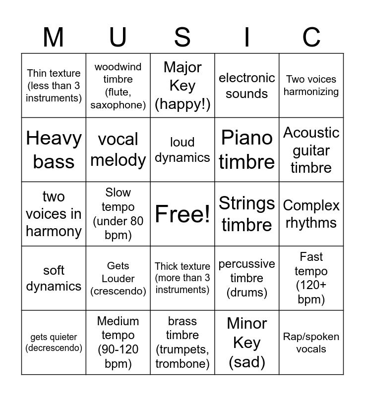 This bingo card has a free space and 24 words: Gets Louder (crescendo), Medium tempo (90-120 bpm), loud dynamics, gets quieter (decrescendo), Two voices harmonizing, Thin texture (less than 3 instruments), Heavy bass, woodwind timbre (flute, saxophone), Strings timbre, Thick texture (more than 3 instruments), Piano timbre, two voices in harmony, percussive timbre (drums), Fast tempo (120+ bpm), vocal melody, Minor Key (sad), Complex rhythms, Major Key (happy!), Acoustic guitar timbre, Slow tempo (under 80 bpm), Rap/spoken vocals, soft dynamics, electronic sounds and brass timbre (trumpets, trombone).