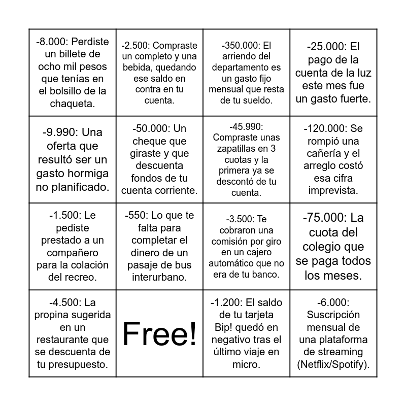 This bingo card has 21 words: Free!, -15.000: Le debes quince mil pesos a tu hermano por una entrada al cine., -2.500: Compraste un completo y una bebida, quedando ese saldo en contra en tu cuenta., -500.000: Tu familia pidió un préstamo al banco y ahora tiene esa deuda inicial., -1.200: El saldo de tu tarjeta Bip! quedó en negativo tras el último viaje en micro., -45.990: Compraste unas zapatillas en 3 cuotas y la primera ya se descontó de tu cuenta., -8.000: Perdiste un billete de ocho mil pesos que tenías en el bolsillo de la chaqueta., -350.000: El arriendo del departamento es un gasto fijo mensual que resta de tu sueldo., -3.500: Te cobraron una comisión por giro en un cajero automático que no era de tu banco., -120.000: Se rompió una cañería y el arreglo costó esa cifra imprevista., -1.500: Le pediste prestado a un compañero para la colación del recreo., -25.000: El pago de la cuenta de la luz este mes fue un gasto fuerte., -6.000: Suscripción mensual de una plataforma de streaming (Netflix/Spotify)., -2.000: El interés por pagar atrasada una cuenta de servicios básicos., -50.000: Un cheque que giraste y que descuenta fondos de tu cuenta corriente., -18.500: El costo de la carga de gas licuado para la estufa en invierno., -4.500: La propina sugerida en un restaurante que se descuenta de tu presupuesto., -550: Lo que te falta para completar el dinero de un pasaje de bus interurbano., -9.990: Una oferta que resultó ser un gasto hormiga no planificado., -75.000: La cuota del colegio que se paga todos los meses. and -200.000: El monto que bajó el valor de una inversión en la bolsa de comercio..