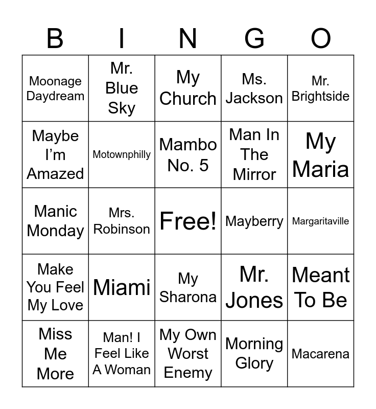 This bingo card has a free space and 59 words: Miss Independent, Man! I Feel Like A Woman, Milkshake, Make You Feel My Love, Morning Glory, Mo Money Mo Problems, Motownphilly, Mirrors, Man In The Mirror, Mean It, Ms. Jackson, Mercy, Maybe I’m Amazed, Maria Maria, Moon Over Mexico, Moonage Daydream, Macarena, Mr. Brightside, Mama Mia, Mambo No. 5, Mayberry, My Church, Miss Me More, Meant To Be, Mamas Broken Heart, Make it Sweet Millionaire, Made For You, May We All, My Maria, Mud On The Tires, My Kinda Party, Midnight Train To Memphis, More Than You Know, My Girl, Mr. Blue Sky, My Life, More Than A Feeling, Mrs. Robinson, Modern Love, Manic Monday, Misery Business, Miami, Margaritaville, Maneater, Men In Black, My Heart Will Go On, More Than Words, More Than A Woman, My Sharona, My Own Worst Enemy, Mary Jane’s Last Dance, Mercy Me, Material Girl, Midnight Special, Maggie Mae, Mr. Jones, Miles On It, Me Too and My House.
