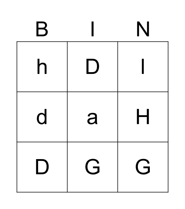 This bingo card has 36 words: A, B, C, D, E, F, G, H, a, b, c, d, e, f, g, h, i, j, k, l, m, n, A, B, C, D, E, F, G, H, I, J, K, L, M and N.