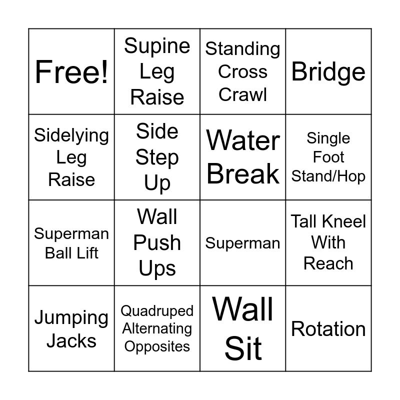 This bingo card has 16 words: Jumping Jacks, Quadruped Alternating Opposites, Standing Cross Crawl, Bridge, Sidelying Leg Raise, Supine Leg Raise, Superman, Tall Kneel With Reach, Free!, Side Step Up, Wall Sit, Single Foot Stand/Hop, Superman Ball Lift, Wall Push Ups, Water Break and Rotation.