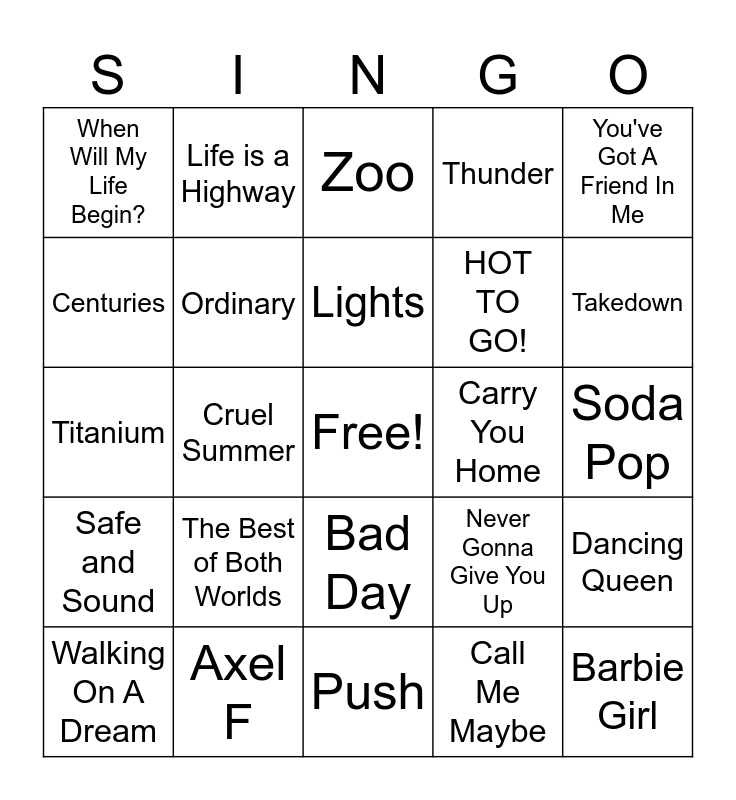 This bingo card has a free space and 24 words: The Best of Both Worlds, Axel F, Lights, Walking On A Dream, You've Got A Friend In Me, When Will My Life Begin?, Centuries, Life is a Highway, Carry You Home, Bad Day, HOT TO GO!, Titanium, Never Gonna Give You Up, Dancing Queen, Ordinary, Call Me Maybe, Soda Pop, Zoo, Takedown, Cruel Summer, Barbie Girl, Safe and Sound, Thunder and Push.