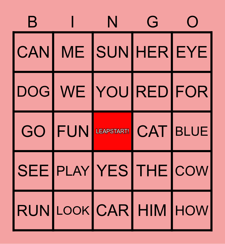 This bingo card has a free space and 24 words: RUN, PLAY, YOU, HIM, EYE, CAN, ME, SUN, CAT, BLUE, GO, WE, THE, COW, DOG, LOOK, CAR, HER, FOR, SEE, FUN, YES, RED and HOW.