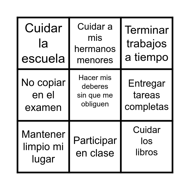 This bingo card has 18 words: Escuchar al profesor, Cumplir promesas, Terminar trabajos a tiempo, Cuidar la escuela, Traer los materiales necesarios, No copiar en el examen, Guardar mis cosas después de usarlas, Cuidar a mis hermanos menores, Participar en clase, Cuidar los libros, Ser puntual en la escuela, Hacer mis deberes sin que me obliguen, Practicar lo que me enseñan, Entregar tareas completas, Mantener limpio mi lugar, Apagar la luz cuando no se usa, Hablar con respeto and Esforzarme aunque sea difícil.