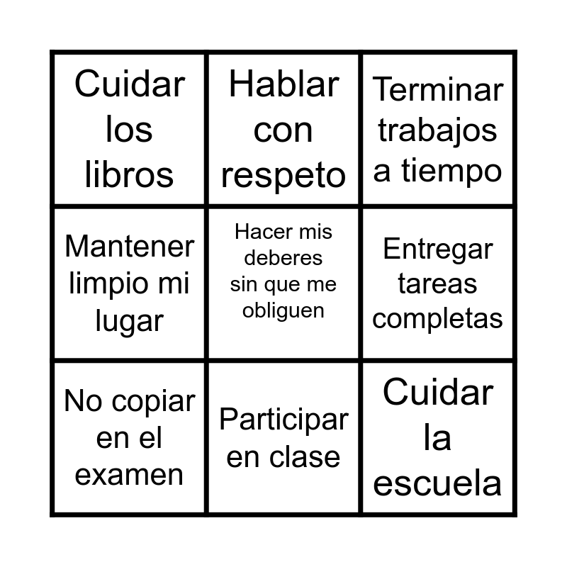 This bingo card has 18 words: Escuchar al profesor, Cumplir promesas, Terminar trabajos a tiempo, Cuidar los libros, Traer los materiales necesarios, Mantener limpio mi lugar, Guardar mis cosas después de usarlas, Hablar con respeto, Participar en clase, Cuidar la escuela, Ser puntual en la escuela, Hacer mis deberes sin que me obliguen, Practicar lo que me enseñan, Entregar tareas completas, No copiar en el examen, Apagar la luz cuando no se usa, Cuidar a mis hermanos menores and Esforzarme aunque sea difícil.