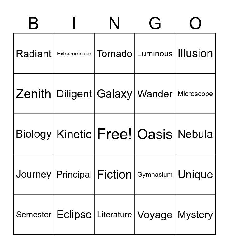 This bingo card has a free space and 40 words: Algebra, Biology, Cafeteria, Diligent, Eclipse, Fiction, Galaxy, Homework, Illusion, Journey, Kinetic, Luminous, Mystery, Nebula, Oasis, Principal, Quest, Radiant, Safari, Tornado, Unique, Voyage, Wander, Zenith, Abundant, Bizarre, Courage, Harmony, Paradox, Locker, Schedule, Semester, Backpack, Gymnasium, Microscope, Literature, Orchestra, Project, Extracurricular and Yearbook.