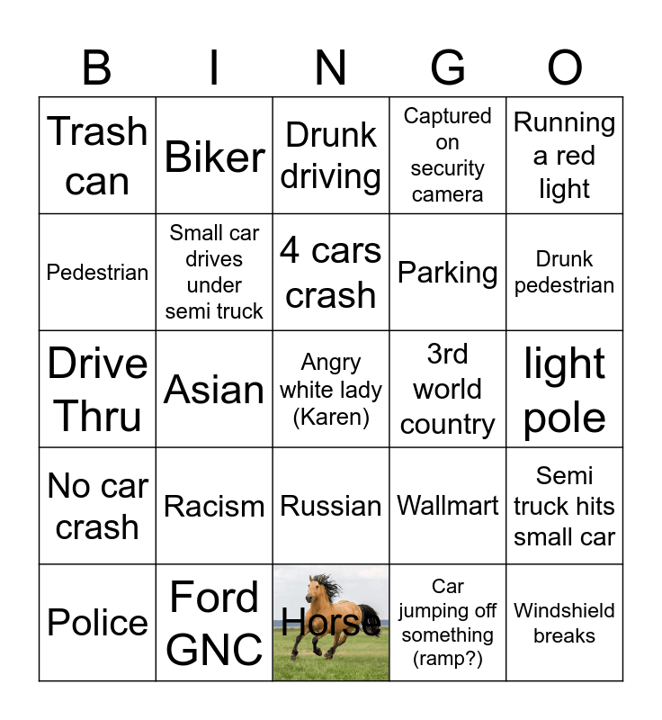 This bingo card has 1 images, a free space and 24 words: Racism, Ford GNC, 4 cars crash, Police, Running a red light, Trash can, Pedestrian, Biker, 3rd world country, Russian, Parking, Drive Thru, Wallmart, Semi truck hits small car, Small car drives under semi truck, Car jumping off something (ramp?), light pole, Drunk driving, Drunk pedestrian, Asian, Windshield breaks, No car crash, Captured on security camera and Horse.