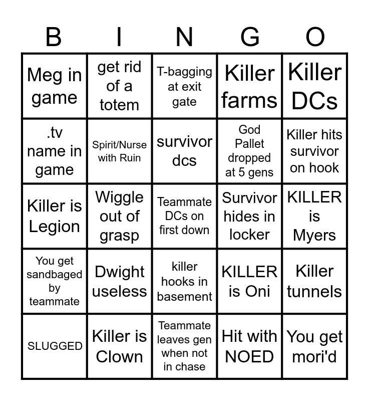 This bingo card has a free space and 24 words: Dwight useless, Killer is Clown, survivor dcs, SLUGGED, Killer DCs, Meg in game, .tv name in game, get rid of a totem, Survivor hides in locker, killer hooks in basement, God Pallet dropped at 5 gens, Killer is Legion, KILLER is Oni, Killer tunnels, Spirit/Nurse with Ruin, Hit with NOED, KILLER is Myers, T-bagging at exit gate, Killer hits survivor on hook, Wiggle out of grasp, You get mori'd, You get sandbaged by teammate, Killer farms and Teammate leaves gen when not in chase.