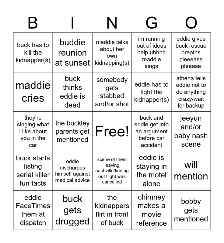 This bingo card has a free space and 24 words: eddie discharges himself against medical advice, buck gets drugged, somebody gets stabbed and/or shot, eddie FaceTimes them at dispatch, eddie gives buck rescue breaths pleeease pleease, buck has to kill the kidnapper(s), maddie cries, buddie reunion at sunset, buck and eddie get into an argument before car accident, scene of them leaving nashville/finding out flight was cancelled, eddie has to fight the kidnapper(s), they’re singing what i like about you in the car, eddie is staying in the motel alone, will mention, buck thinks eddie is dead, chimney makes a movie reference, jeeyun and/or baby nash scene, maddie talks about her own kidnapping(s), athena tells eddie not to do anything crazy/wait for backup, the buckley parents get mentioned, bobby gets mentioned, buck starts listing serial killer fun facts, im running out of ideas help uhhhh maddie sings and the kidnappers flirt in front of buck.