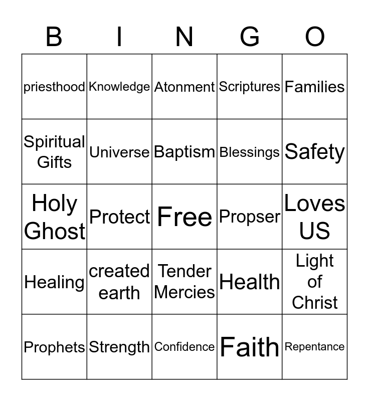 This bingo card has a free space and 24 words: created earth, Strength, Baptism, Prophets, Families, priesthood, Spiritual Gifts, Knowledge, Propser, Tender Mercies, Blessings, Holy Ghost, Health, Light of Christ, Universe, Faith, Loves US, Atonment, Safety, Protect, Repentance, Healing, Scriptures and Confidence.