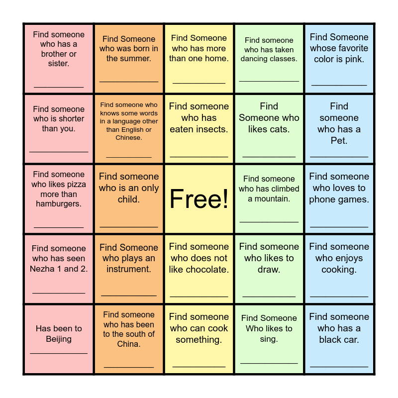 This bingo card has a free space and 25 words: Has been to Beijing ____________, Find Someone who plays an instrument. ___________, Find someone who has eaten insects. ___________, Find Someone Who likes to sing. ____________, Find someone who has a Pet. ___________, Find someone who has a brother or sister. ___________, Find Someone who was born in the summer. _____________, Find Someone who has more than one home. ___________, Find Someone who likes cats. __________, Find someone who enjoys cooking. ___________, Find someone who likes pizza more than hamburgers. ___________, Find someone who knows some words in a language other than English or Chinese. ____________, Find someone who likes to draw. __________, Find someone who has a black car. ___________, Find someone who is shorter than you. _____________, Find someone who has been to the south of China. ___________, Find someone who can cook something. __________, Find someone who has taken dancing classes. ______________, Find someone who loves to phone games. ___________, Find someone who has seen Nezha 1 and 2. ___________, Find someone who is an only child. ___________, Find someone who does not like chocolate. ___________, Find someone who has climbed a mountain. _____________, Find Someone whose favorite color is pink. ___________ and Find someone who is wearing a blue shirt. ____________.