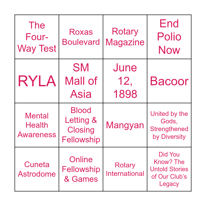 This bingo card has 69 words: March, Rotary International, Self, 1968, Rotary International, The Rotary Foundation, End Polio Now, October 24, RYLA, Interact, Rotary Wheel, Rotary International, The Four-Way Test, Rotary Magazine, Paul Harris, United by the Gods, Strengthened by Diversity, Fire Prevention Month Activity, Mental Health Awareness, Why I Rotaract?, Did You Know? The Untold Stories of Our Club’s Legacy, Online Fellowship & Games, All About Juana, Blood Letting & Closing Fellowship, Manila, Intramuros, Rizal Park, Pasig River, National Museum Complex, Quiapo Church, Manila Cathedral, Roxas Boulevard, UST, Port of Manila, Binondo, Manila City Hall Clock Tower, Quezon Bridge, Ninoy Aquino International Airport, Entertainment City, SM Mall of Asia, SMX Convention Center, CCP, Cuneta Astrodome, EDSA, Manila Bay, PITX, Cavite, Kawit, Emilio Aguinaldo, Kawit, June 12, 1898, Bacoor, Taal Lake, Tagaytay, Corregidor Island, Mamburao, Mindoro Island, Mindoro Strait, Tamaraw, Mounts Iglit–Baco National Park, Mangyan, West Philippine Sea, Verde Island Passage, Sablayan, José Rizal, Luzon, Philippine Peso, Filipino, West Philippine Sea and SM Mall of Asia.