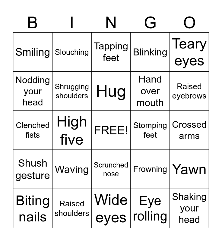 This bingo card has a free space and 28 words: Yawn, Flush cheeks, Hand over mouth, Eye rolling, Nodding your head, Tapping feet, Slouching, Shush gesture, Stomping feet, Biting nails, Clenched fists, Blinking, Raised shoulders, Wide eyes, Raised eyebrows, Avoiding eye contact, Waving, Shrugging shoulders, Hug, Scrunched nose, Smiling, Holding hands, Shaking your head, High five, Crossed arms, Frowning, Teary eyes and Head down.