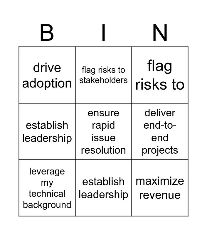 This bingo card has a free space and 13 words: risk mitigation, drive retention, leverage my technical background, flag risks to stakeholders, establish leadership, maximize revenue, fast-paced environments, overlap with the US team, establish leadership, drive adoption, deliver end-to-end projects, flag risks to and drive retention.