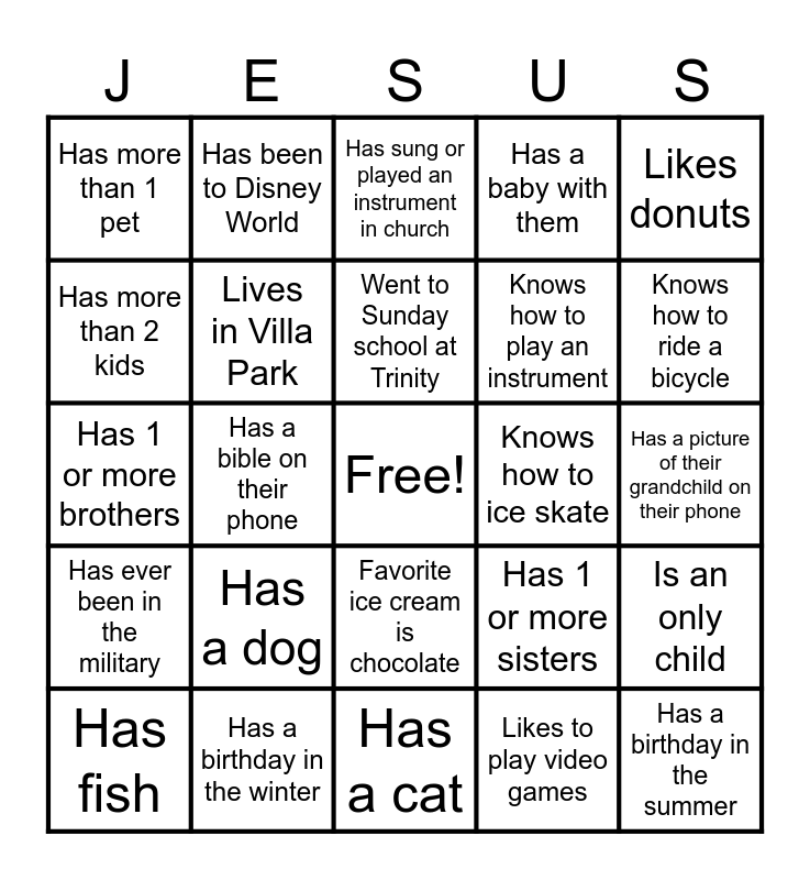 This bingo card has a free space and 25 words: Has a dog, Has a cat, Went to Sunday school at Trinity, Has fish, Likes donuts, Has more than 1 pet, Has more than 2 kids, Has been to Disney World, Knows how to ice skate, Favorite ice cream is chocolate, Knows how to play an instrument, Has 1 or more brothers, Has 1 or more sisters, Is an only child, Lives in Villa Park, Has a picture of their child on their phone, Has a picture of their grandchild on their phone, Has sung or played an instrument in church, Knows how to ride a bicycle, Has a bible on their phone, Has a birthday in the summer, Has a birthday in the winter, Has ever been in the military, Has a baby with them and Likes to play video games.