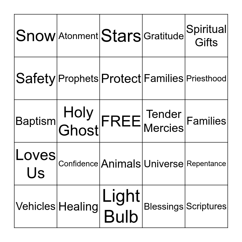This bingo card has a free space and 24 words: Confidence, Healing, Protect, Vehicles, Spiritual Gifts, Snow, Safety, Atonment, Tender Mercies, Animals, Families, Baptism, Universe, Repentance, Prophets, Blessings, Families, Stars, Priesthood, Holy Ghost, Scriptures, Loves Us, Gratitude and Light Bulb.