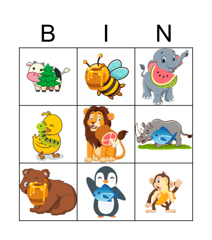 This bingo card has 10 images and 10 words: 🐟, 🍉, 🌲, 🍖, 🐛, 🍯, 🍯, 🍃, 🐟 and 🍌.