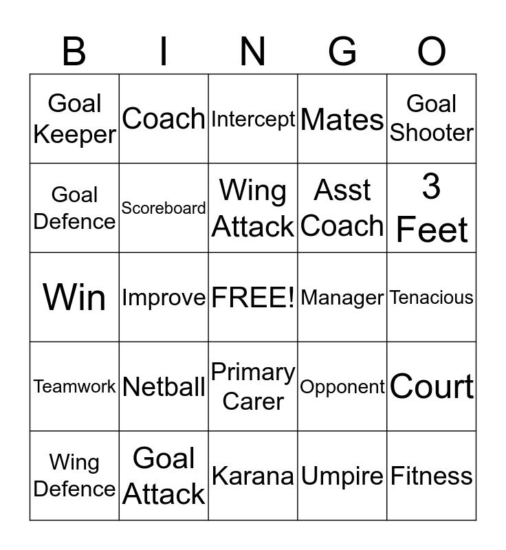 This bingo card has a free space and 24 words: Netball, Goal Attack, Wing Attack, Wing Defence, Goal Shooter, Goal Keeper, Goal Defence, Coach, Manager, Primary Carer, Asst Coach, Win, Opponent, Court, Scoreboard, Umpire, Tenacious, Intercept, 3 Feet, Improve, Fitness, Teamwork, Mates and Karana.