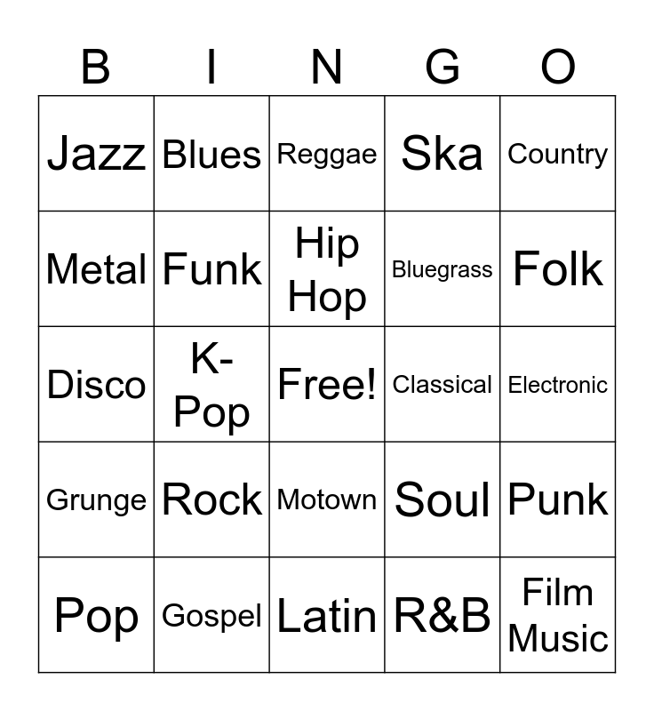 This bingo card has a free space and 24 words: Pop, Rock, Hip Hop, R&B, Country, Jazz, Blues, Reggae, Classical, Electronic, Disco, Funk, Soul, Punk, Metal, Gospel, Latin, Ska, Folk, Grunge, K-Pop, Motown, Bluegrass and Film Music.