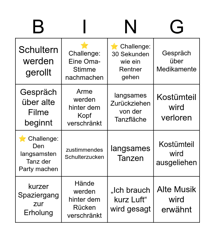 This bingo card has 121 words: Free!, Rückenschmerzen werden erwähnt, Knie werden massiert, Brille wird gesucht, Brille wird gefunden, „Früher war alles besser“ fällt, Gespräch über Medikamente, Gespräch über Arztbesuch, Spazierstock wird benutzt, Perücke verrutscht, Strickjacke wird ausgezogen, Hausschuhe erscheinen auf der Tanzfläche, Sandalen mit Socken werden gesichtet, Bademantel wird getragen, Schlafanzug wird getragen, Gehstock wird zum Tanzen benutzt, Rücken wird gedehnt, Nacken wird massiert, „Mein Rücken“ wird gesagt, „Mein Knie“ wird gesagt, Uhrzeit wird laut gefragt, ⭐ Challenge: 30 Sekunden wie ein Rentner gehen, Diskussion über Schlafenszeit, Gespräch über Rente, Alte Partygeschichten werden erzählt, Alte Musik wird erwähnt, Lesebrille wird aufgesetzt, Hut wird aufgesetzt, Hut wird verloren, Rollator taucht auf, ⭐ Challenge: Eine spontane Rentner-Lebensweisheit verkünden, Kostümteil wird ausgeliehen, Kostümteil wird verloren, Kostüm wird erklärt, Kostüm wird bewundert, Rentnerhut wird getragen, Hosenträger werden sichtbar, Strickpullover wird getragen, Wärmflasche wird erwähnt, Gespräch über Gesundheit, Gespräch über Blutdruck, ⭐ Challenge: Alle in der Nähe zum Anstoßen bringen, langsames Aufstehen vom Stuhl, sehr langsames Gehen, Sitzplatz wird gesucht, Sitzpause wird eingelegt, tiefer Seufzer, Hände werden hinter dem Rücken verschränkt, skeptischer Blick auf die Tanzfläche, ⭐ Challenge: Zwei Leute einander vorstellen, nostalgische Geschichte beginnt, „Damals…“ fällt im Gespräch, spontane Lebensweisheit, langes Kopfnicken während Gespräch, ruhiges Mitwippen zur Musik, Hände auf den Hüften, Stirn wird gerieben, Brille wird geputzt, Brille rutscht nach unten, ⭐ Challenge: Eine Oma-Stimme nachmachen, Gespräch über Schlaf, „Nur noch ein Drink“ fällt, Diskussion über Lautstärke, Pause auf dem Sofa, Rücken wird durchgedrückt, Arme werden hinter dem Kopf verschränkt, ⭐ Challenge: Einen „Früher war alles besser“ Monolog halten, Hut wird weitergereicht, Brille wird ausgeliehen, Stock wird weitergereicht, langsames Tanzen, Tanz mit Gehstock, Tanz mit Hut, Tanz mit übertriebener Rentnerpose, Hände im Rücken beim Tanzen, ⭐ Challenge: Den langsamsten Tanz der Party machen, vorsichtiges Aufstehen vom Sofa, kurzes Stöhnen beim Aufstehen, tiefes Durchatmen nach dem Tanzen, kurzer Spaziergang zur Erholung, langsames Hinsetzen, Schultern werden gerollt, Arme werden ausgestreckt, Beine werden ausgeschüttelt, ⭐ Challenge: Drei Fremden ein Kompliment machen, vorsichtige Schritte zur Bar, „Ich brauche meine Brille“ wird gesagt, „Ich brauche Wasser“ wird gesagt, „Ich brauch kurz Luft“ wird gesagt, „Ich bleib nur kurz“ wird gesagt, „Das wird morgen weh tun“ wird gesagt, „Ich bin nicht mehr 20“ wird gesagt, ⭐ Challenge: Ein Gruppenfoto mit fünf Leuten organisieren, Brille wird vom Boden aufgehoben, Hosenträger werden zurechtgezogen, Schal wird angelegt, Kostüm wird nachgebessert, ⭐ Challenge: Die ganze Gruppe kurz zum Klatschen bringen, Gespräch über alte Filme beginnt, Gespräch über alte Zeiten beginnt, nostalgisches Lachen, lange Anekdote wird erzählt, ⭐ Challenge: Eine kurze Dankesrede halten, kurze Pause auf der Tanzfläche, langsames Zurückziehen von der Tanzfläche, ruhiges Mitklatschen, langsame Drehung beim Tanzen, kleine Seitenschritte beim Tanzen, rhythmisches Kopfnicken, ⭐ Challenge: Eine Mini-Modenschau mit Kostümen starten, kurzer Blick auf die Uhr, kurzer Blick Richtung Ausgang, ruhiges Beobachten der Tanzfläche, Gespräch am Rand der Tanzfläche, ruhige Unterhaltung auf dem Sofa, zustimmendes Schulterzucken, Hände werden verschränkt, Arme werden verschränkt, Kostüm wird fotografiert, gemeinsames Lachen über ein Kostüm and ⭐ Challenge: „Bingo!“ möglichst dramatisch rufen.