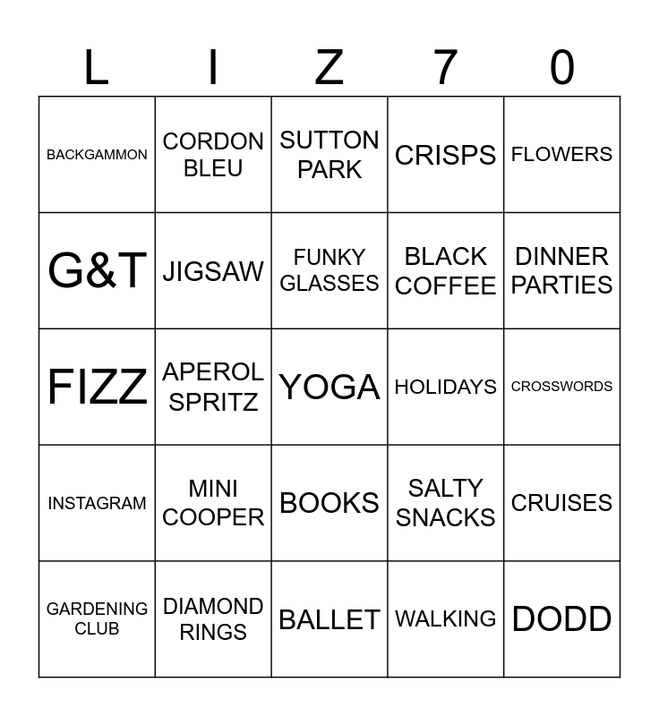 This bingo card has 25 words: MINI COOPER, BALLET, FUNKY GLASSES, GARDENING CLUB, FLOWERS, BACKGAMMON, G&T, CORDON BLEU, HOLIDAYS, BOOKS, BLACK COFFEE, FIZZ, SALTY SNACKS, CRUISES, JIGSAW, DODD, CROSSWORDS, SUTTON PARK, DINNER PARTIES, APEROL SPRITZ, YOGA, DIAMOND RINGS, INSTAGRAM, CRISPS and WALKING.