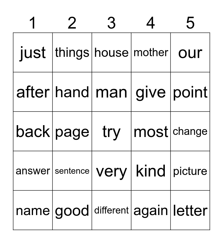 This bingo card has a free space and 24 words: sentence, good, man, name, our, just, after, things, most, very, give, back, kind, picture, hand, again, change, house, point, page, letter, answer, mother and different.