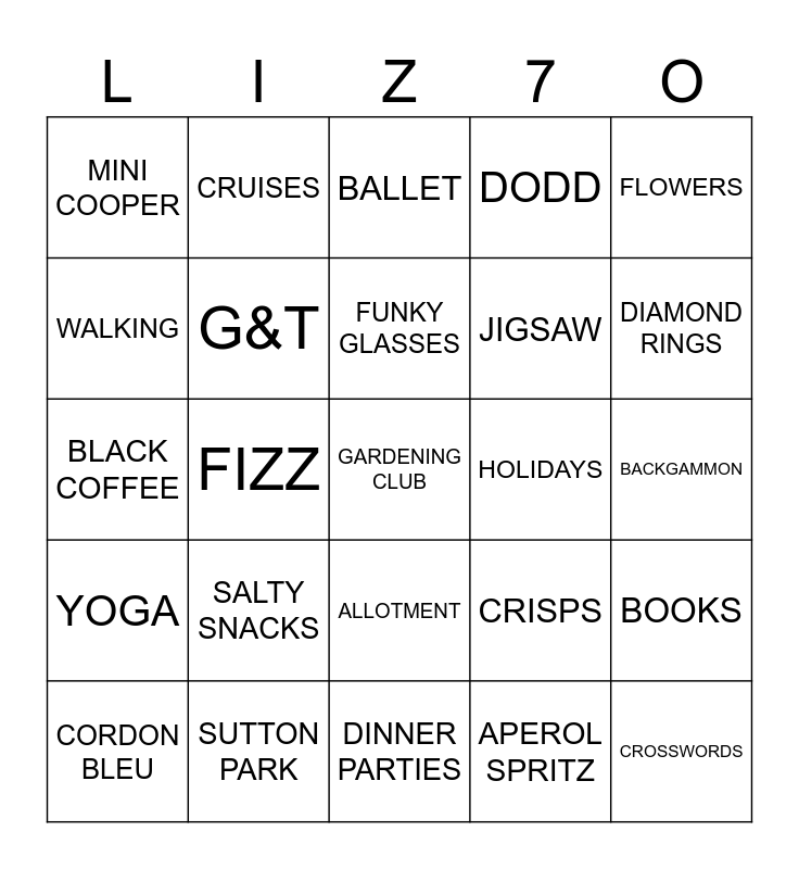 This bingo card has a free space and 24 words: SALTY SNACKS, SUTTON PARK, FUNKY GLASSES, CORDON BLEU, FLOWERS, MINI COOPER, WALKING, CRUISES, HOLIDAYS, ALLOTMENT, JIGSAW, BLACK COFFEE, CRISPS, BOOKS, G&T, APEROL SPRITZ, BACKGAMMON, BALLET, DIAMOND RINGS, FIZZ, CROSSWORDS, YOGA, DODD and DINNER PARTIES.