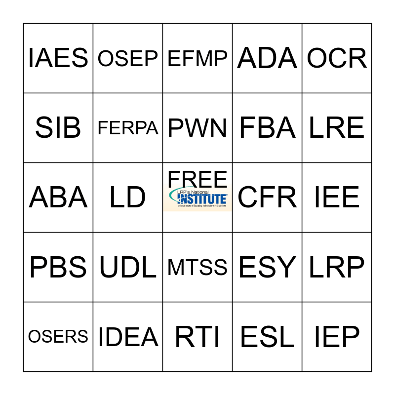 This bingo card has a free space and 34 words: ASL, ESL, STEM, ESEA, PBS, FERPA, OCR, OSERS, OSEP, SDI, PWN, EFMP, IHO, BIP, CFR, LRE, IDEA, ABA, UDL, ESY, MTSS, OHI, IAES, IEE, RTI, IEP, ADA, MDR, FBA, SIB, LEA, LD, LRP and ALJ.