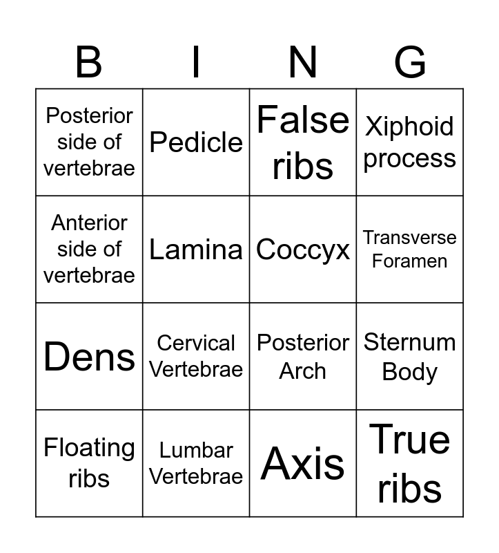 This bingo card has 26 words: Spinous Process, Transverse Process, Transverse Foramen, Vertebral Foramen, Anterior side of vertebrae, Posterior side of vertebrae, Lamina, Pedicle, Axis, Atlas, Dens, Posterior Arch, Anterior Arch, Costal Cartilage, Sternum Body, Manubrium, Xiphoid process, True ribs, False ribs, Floating ribs, Cervical Vertebrae, Thoracic Vertebrae, Lumbar Vertebrae, Sacral Vertebrae, Coccyx and Vertebral Body.