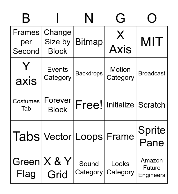 This bingo card has a free space and 29 words: Green Flag, Control Category, Forever Block, Wait Block, Frames per Second, Bitmap, Events Category, Vector, Initialize, X & Y Grid, Scratch, Amazon Future Engineers, Sound Category, Looks Category, Broadcast, When I receive Block, Loops, Tabs, MIT, Costumes Tab, Frame, Sounds Tab, Motion Category, Y axis, X Axis, Change Size by Block, Sprite Pane, Backdrops and Code Area.