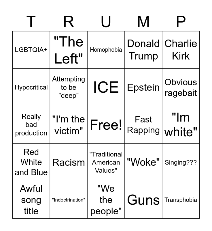This bingo card has a free space and 24 words: Racism, "Indoctrination", ICE, Awful song title, Charlie Kirk, LGBTQIA+, Hypocritical, "The Left", Fast Rapping, "Traditional American Values", Epstein, Really bad production, "Woke", Singing???, Attempting to be "deep", Guns, "Im white", Homophobia, Obvious ragebait, "I'm the victim", Transphobia, Red White and Blue, Donald Trump and "We the people".