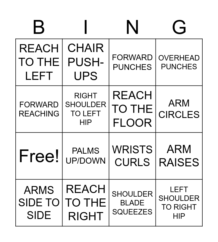 This bingo card has 20 words: ARM RAISES, SHOULDER ROLLS, FORWARD PUNCHES, BICEP CURLS, ARMS SIDE TO SIDE, FORWARD REACHING, REACH TO THE RIGHT, REACH TO THE LEFT, Free!, CHAIR PUSH-UPS, PALMS UP/DOWN, WRISTS CURLS, RIGHT SHOULDER TO LEFT HIP, LEFT SHOULDER TO RIGHT HIP, REACH TO THE FLOOR, ARMS ONLY JUMPING JACKS, ARM CIRCLES, OVERHEAD PUNCHES, SHOULDER BLADE SQUEEZES and LIST 1 WAY TO PREVENT A FALL.