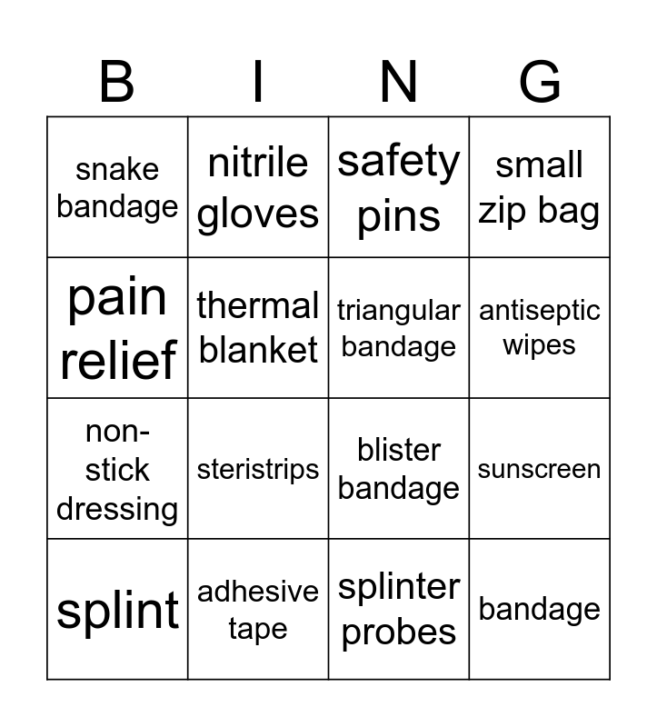This bingo card has 24 words: bandaid, sterile gauze, antiseptic wipes, burn gel, pain relief, snake bandage, thermal blanket, nitrile gloves, adhesive tape, anti histamine, non-stick dressing, blister bandage, check expiry dates, stingose, triangular bandage, scissors, splinter probes, safety pins, steristrips, sunscreen, splint, bandage, small zip bag and keep it simple.