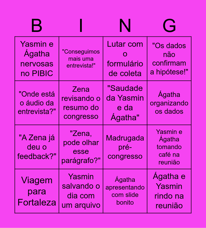 This bingo card has 26 words: Grudhe!, Yasmin transcrevendo entrevista, Ágatha organizando os dados, Zena pedindo o relatório, "Onde está o áudio da entrevista?", Yasmin e Ágatha nervosas no PIBIC, Zena revisando o resumo do congresso, "Conseguimos mais uma entrevista!", Ágatha apresentando com slide bonito, Yasmin achando uma citação perfeita, "A Zena já deu o feedback?", Madrugada pré-congresso, Entrevista que durou horas, Resumo do PIBIC aprovado, Yasmin e Ágatha tomando café na reunião, Zena orgulhosa na apresentação, "Os dados não confirmam a hipótese!", Ágatha e Yasmin rindo na reunião, Lutar com o formulário de coleta, Viagem para Fortaleza, "Zena, pode olhar esse parágrafo?", Pasta "Dados Finais - Agora vai", Yasmin salvando o dia com um arquivo, Ágatha encontrando um erro na ABNT, "Saudade da Yasmin e da Ágatha" and Sucesso na nova etapa!.