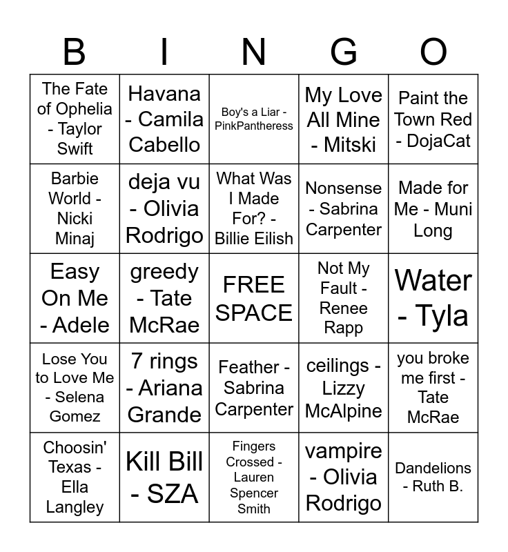 This bingo card has a free space and 29 words: Choosin' Texas - Ella Langley, Man I Need - Olivia Dean, greedy - Tate McRae, Golden - K-Pop Demon Hunters, The Fate of Ophelia - Taylor Swift, Boy's a Liar - PinkPantheress, deja vu - Olivia Rodrigo, 7 rings - Ariana Grande, Not My Fault - Renee Rapp, Kill Bill - SZA, Water - Tyla, Dandelions - Ruth B., Fingers Crossed - Lauren Spencer Smith, vampire - Olivia Rodrigo, Made for Me - Muni Long, Reckless - Madison Beer, Feather - Sabrina Carpenter, Lose You to Love Me - Selena Gomez, Paint the Town Red - DojaCat, Easy On Me - Adele, ceilings - Lizzy McAlpine, I miss you, I'm sorry - Gracie Abrams, Nonsense - Sabrina Carpenter, Barbie World - Nicki Minaj, My Love All Mine - Mitski, Havana - Camila Cabello, you broke me first - Tate McRae, What Was I Made For? - Billie Eilish and Don't Start Now - Dua Lipa.