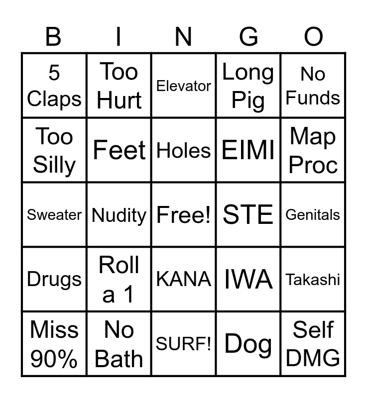 This bingo card has a free space and 24 words: Roll a 1, No Bath, Holes, Miss 90%, No Funds, 5 Claps, Too Silly, Too Hurt, STE, KANA, EIMI, Sweater, IWA, Takashi, Feet, Dog, Genitals, Elevator, Map Proc, Nudity, Self DMG, Drugs, Long Pig and SURF!.