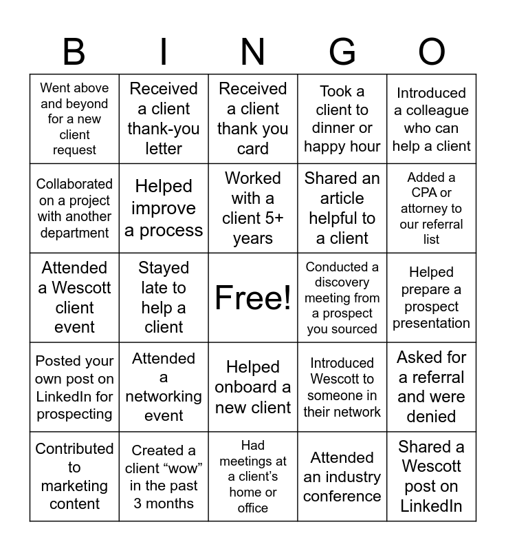 This bingo card has a free space and 24 words: Attended a networking event, Created a client “wow” in the past 3 months, Worked with a client 5+ years, Contributed to marketing content, Introduced a colleague who can help a client, Went above and beyond for a new client request, Collaborated on a project with another department, Received a client thank-you letter, Conducted a discovery meeting from a prospect you sourced, Helped onboard a new client, Shared an article helpful to a client, Attended a Wescott client event, Introduced Wescott to someone in their network, Asked for a referral and were denied, Helped improve a process, Attended an industry conference, Helped prepare a prospect presentation, Received a client thank you card, Added a CPA or attorney to our referral list, Stayed late to help a client, Shared a Wescott post on LinkedIn, Posted your own post on LinkedIn for prospecting, Took a client to dinner or happy hour and Had meetings at a client’s home or office.