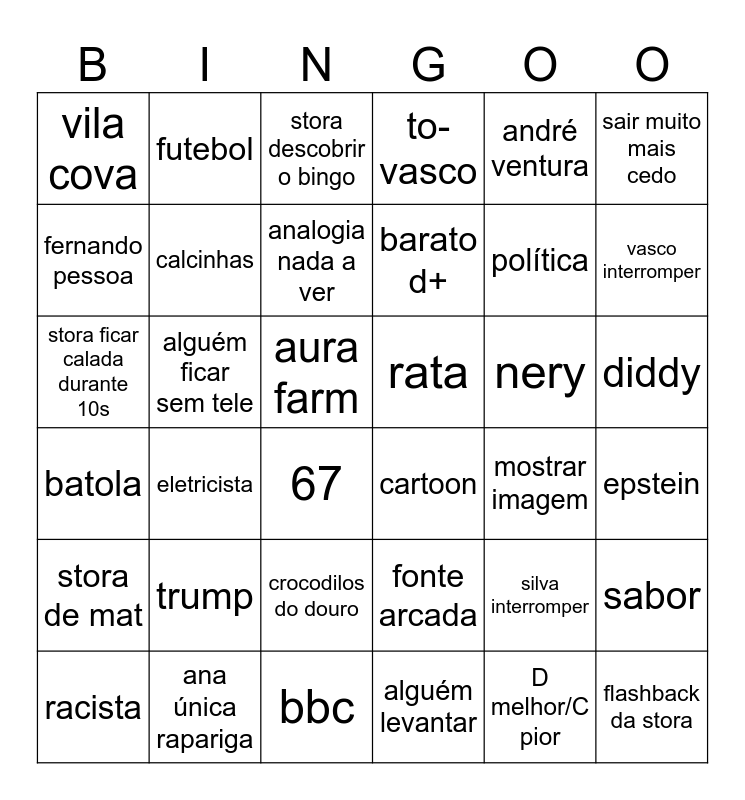 This bingo card has 36 words: fonte arcada, crocodilos do douro, alguém levantar, fernando pessoa, batola, rata, calcinhas, bbc, andré ventura, silva interromper, vasco interromper, to-vasco, sabor, alguém ficar sem tele, barato d+, vila cova, stora de mat, nery, stora ficar calada durante 10s, stora descobrir o bingo, aura farm, eletricista, cartoon, 67, mostrar imagem, futebol, política, ana única rapariga, analogia nada a ver, sair muito mais cedo, flashback da stora, racista, epstein, diddy, trump and D melhor/C pior.