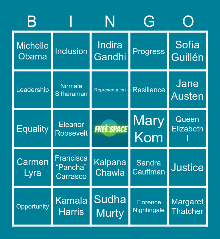 This bingo card has a free space and 30 words: Kamala Harris, Ruth Bader Ginsburg, Eleanor Roosevelt, Harriet Tubman, Michelle Obama, Indira Gandhi, Nirmala Sitharaman, Kalpana Chawla, Mary Kom, Sudha Murty, Queen Elizabeth I, Margaret Thatcher, Florence Nightingale, Emmeline Pankhurst, Jane Austen, Laura Chinchilla, Sandra Cauffman, Carmen Lyra, Francisca “Pancha” Carrasco, Sofía Guillén, Equality, Empowerment, Inclusion, Resilience, Leadership, Progress, Justice, Opportunity, Representation and Solidarity.