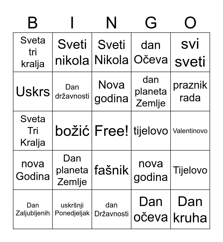 This bingo card has a free space and 27 words: nova godina, sveti nikola, dan planeta Zemlje, dan Državnosti, Uskrs, Sveti Nikola, Sveti nikola, nova Godina, tijelovo, Tijelovo, Sveta Tri Kralja, dan Očeva, Dan Zaljubljenih, uskršnji Ponedjeljak, praznik rada, Praznik rada, Dan državnosti, Nova godina, Dan planeta Zemlje, Sveta tri kralja, Valentinovo, Dan očeva, božić, Dan kruha, fašnik, svi sveti and Svi sveti.