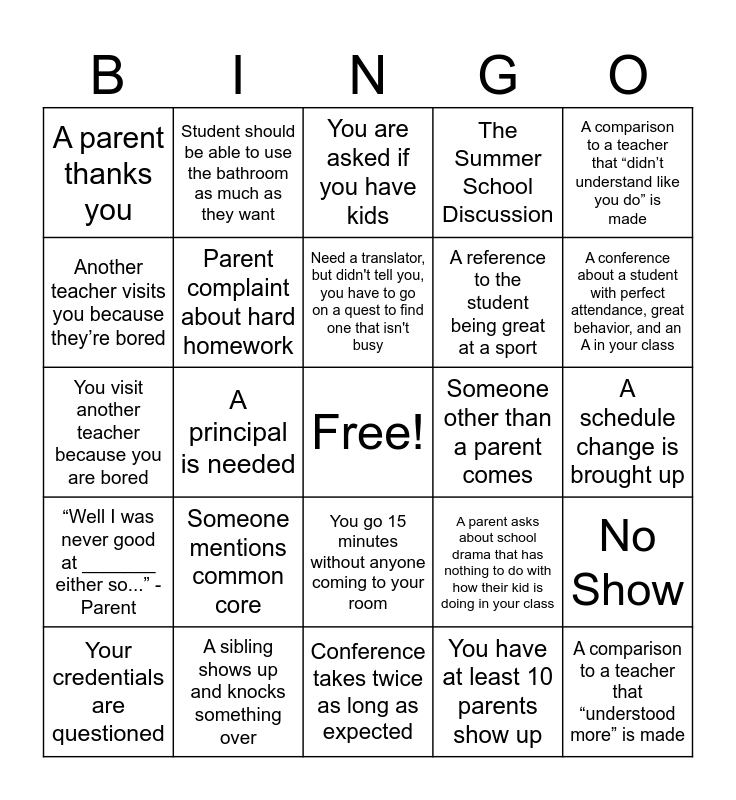 This bingo card has a free space and 29 words: Your credentials are questioned, ADHD or medication is mentioned, A principal is needed, A swear word is used *during a conference, A parent thanks you, You are asked if you have kids, Parent complaint about hard homework, Someone mentions common core, Someone other than a parent comes, A sibling shows up and knocks something over, A schedule change is brought up, A comparison to a teacher that “understood more” is made, Conference takes twice as long as expected, You have at least 10 parents show up, A conference about a student with perfect attendance, great behavior, and an A in your class, “My kid has never had grades like this”, You go 15 minutes without anyone coming to your room, “Well I was never good at _______ either so...” - Parent, A comparison to a teacher that “didn’t understand like you do” is made, You visit another teacher because you are bored, A parent asks about school drama that has nothing to do with how their kid is doing in your class, A parent asks about tutoring or after school programs, A reference to the student being great at a sport, Another teacher visits you because they’re bored, The Summer School Discussion, Student should be able to use the bathroom as much as they want, No Show, Need a translator, but didn't tell you, you have to go on a quest to find one that isn't busy and Former student wanders by to say hi.