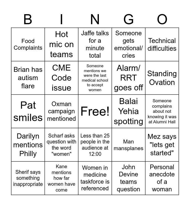 This bingo card has a free space and 24 words: Scharf asks question with the word "women", Kane mentions how far women have come, Someone mentions we were the last medical school to accept women, Sherif says something inappropriate, Technical difficulties, Food Complaints, Brian has autism flare, Hot mic on teams, Balai Yehia spotting, Less than 25 people in the audience at 12:00, Alarm/ RRT goes off, Pat smiles, Man mansplanes, Mez says "lets get started", CME Code issue, John Devine teams question, Someone complains about not knowing it was at Alumni Hall, Jaffe talks for a minute total, Standing Ovation, Oxman campaign mentioned, Personal anecdote of a woman, Darilyn mentions Philly, Someone gets emotional/ cries and Women in medicine taskforce is referenced.