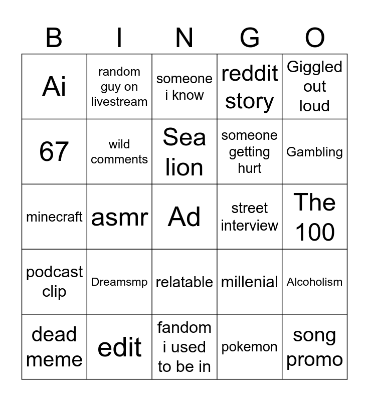 This bingo card has a free space and 24 words: Dreamsmp, edit, Sea lion, dead meme, Giggled out loud, Ai, 67, random guy on livestream, street interview, relatable, someone getting hurt, minecraft, millenial, Alcoholism, wild comments, pokemon, The 100, someone i know, Gambling, asmr, song promo, podcast clip, reddit story and fandom i used to be in.