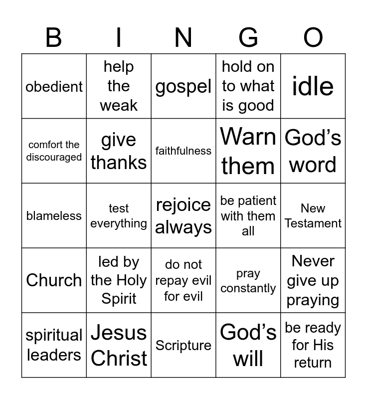 This bingo card has a free space and 24 words: led by the Holy Spirit, Jesus Christ, faithfulness, spiritual leaders, idle, obedient, comfort the discouraged, help the weak, be patient with them all, do not repay evil for evil, Warn them, blameless, pray constantly, Never give up praying, give thanks, God’s will, New Testament, gospel, God’s word, test everything, be ready for His return, Church, hold on to what is good and Scripture.