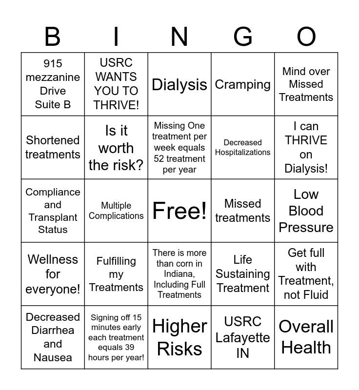 This bingo card has a free space and 24 words: Fulfilling my Treatments, Signing off 15 minutes early each treatment equals 39 hours per year!, Missing One treatment per week equals 52 treatment per year, Decreased Diarrhea and Nausea, Mind over Missed Treatments, 915 mezzanine Drive Suite B, Shortened treatments, USRC WANTS YOU TO THRIVE!, Missed treatments, There is more than corn in Indiana, Including Full Treatments, Decreased Hospitalizations, Compliance and Transplant Status, Life Sustaining Treatment, Get full with Treatment, not Fluid, Is it worth the risk?, USRC Lafayette IN, Low Blood Pressure, Dialysis, I can THRIVE on Dialysis!, Multiple Complications, Overall Health, Wellness for everyone!, Cramping and Higher Risks.